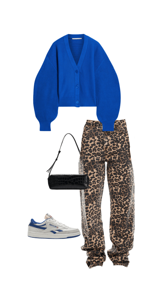 Jeans plural, by the way. Two pairs. One plain, simple pair—I’m currently addicted to the AGOLDE Fusion Mid Rise jeans for a baggy low rise fit. And then one statement pair. For this trip, I’m going with the Lioness Carmela pants—a fun leopard printed denim. I find that a cool denim is one of the easiest ways to make an outfit look effortlessly cool, and for a short trip like this one, I’d rather pair the same simple tee or sweater with a different jean to refresh a look than pack a bunch of different tops. I find that a cool pant impacts an outfit more than swapping a fun top in but keeping the same pair of jeans.