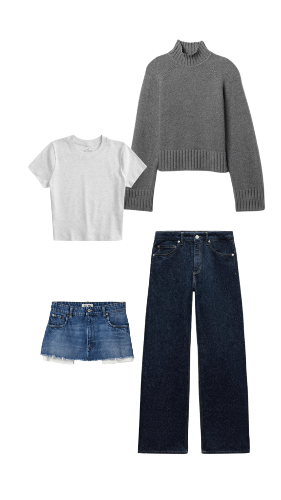 The tee is your basic outfit building block for any layering necessities. Under your sweater, with your mini skirt, etc. Depending on what other pieces you’ve chosen, it’s a great piece to add dimension to simple outfits. The one I’m bringing is a light grey fitted baby tee that pairs with the white sweater I’m packing and the blue cardigan I’m bringing as my alternate. It’s the right length to be worn with both my pairs of jeans, and works with my mini skirt.