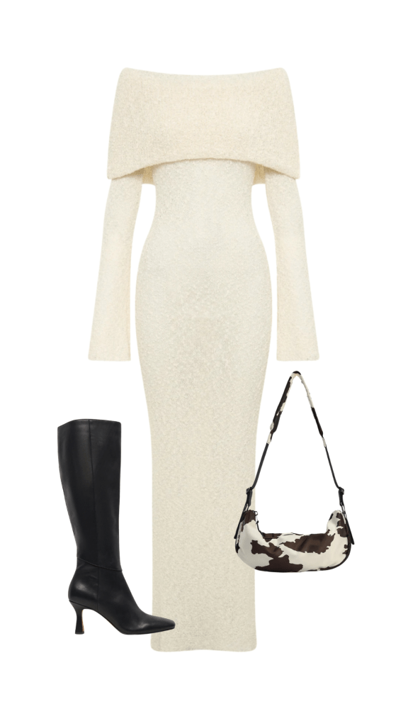 This one’s pretty straightforward. The slightly nicer, dressed-up option for a cute, classy dinner or night out. This isn’t your going out outfit—you’re not thinking about what it would be like to walk into a sweaty bar wearing this. It’s your kind-of-fancy moment. The one I’ve chosen for this trip it’s an off-shoulder boucle maxi dress from Meshki. Comfy and warm enough, but still a fun moment.