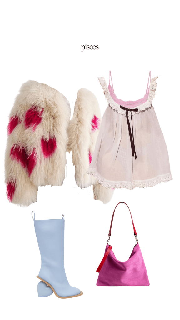 When it comes to style, Pisces’ clothes are just as romantic and dreamy as she is. She loves a ruffle sleeve, cutesy patterns, and fun collars. Soft knits are constantly in rotation, and along with flowy dresses and pastel tones. Pisces loves a statement piece, like a big fuzzy coat or a cool shoe, but one thing is consistent across all of the clothes she wears—an air of playfulness. Pisces wears outfits that fill her with joy—the world is her playground, and she’s playing dress up. Pisces is the main character in her own life, and she’s always styled like she’s about to step onto the set of her own romcom.