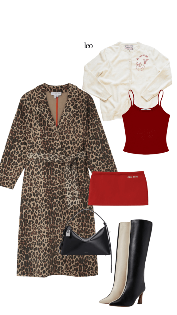 Leo loves fun details, like a funky shaped bag, an oversized coat, or a cool shoe, but there is never too much going on with her outfit. While Leo’s outfits feel eclectic at first glance, a closer look will prove that there’s a sort of theme to every look, making the chaos cohesive. Leo treats every day like a performance, and her outfit is her costume.