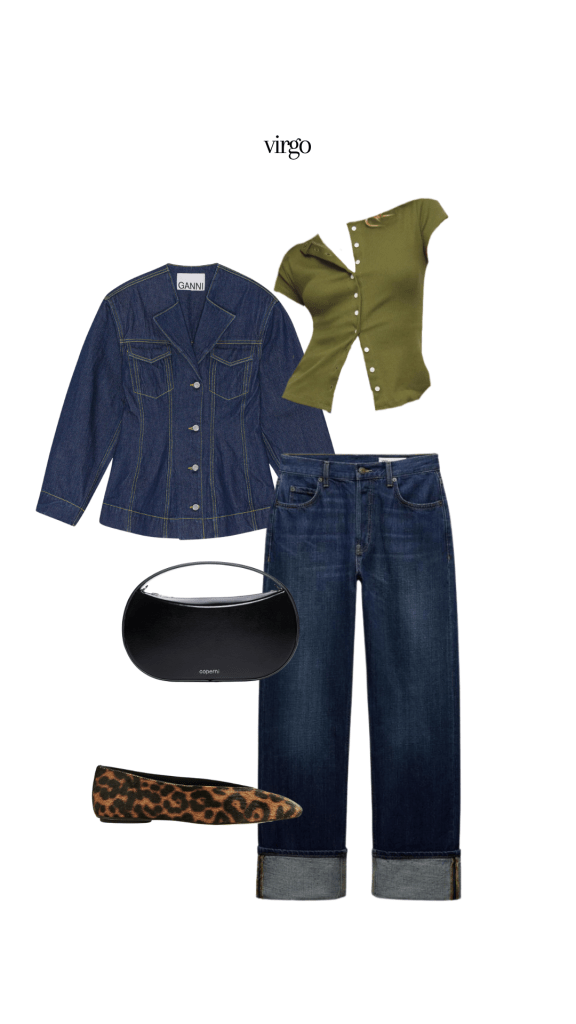 Strong fabrics that hold their shape are a natural choice for Virgo—she’ll rarely go for slouchy fits. Denim, linen, fitted knits—whatever she’s wearing, it’ll fit her well, and you’ll be hard pressed to find her looking creased or wrinkled. Virgo never goes over the top with layers or accessories, instead opting for simple pieces and pairings that make her look effortlessly chic.