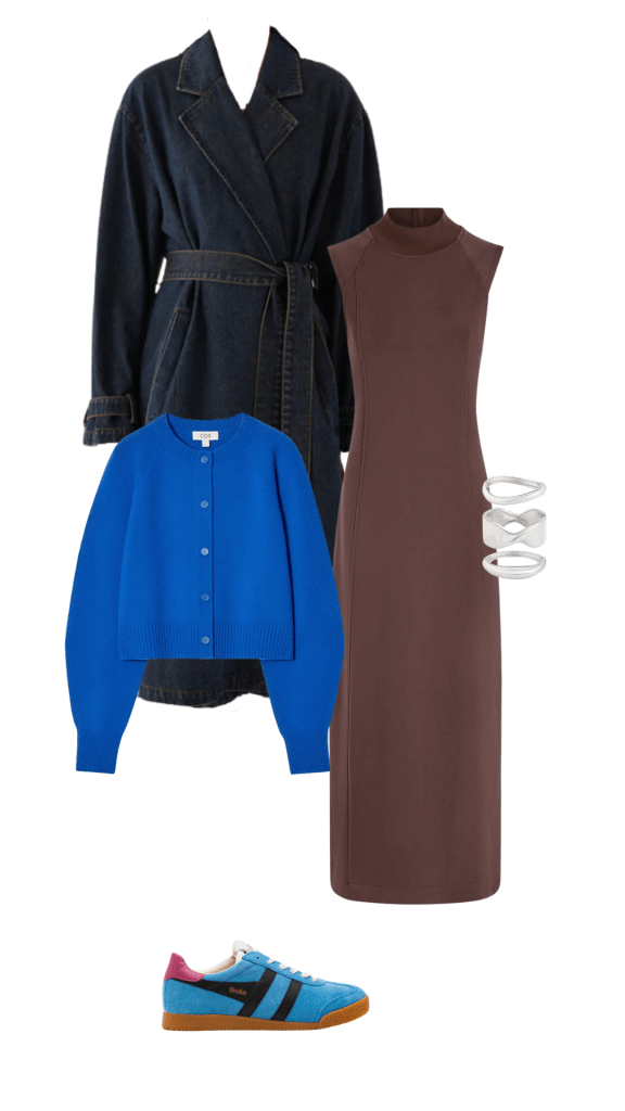 I love a beautiful cobalt blue with shades of brown, too. Actually, I won’t limit myself here. Lighter sky blue and a deeper navy pair amazingly with mocha as well, and I love the idea of styling a brown piece with multiple tones of blue. A dark denim trench, a bright blue cardigan, a pale blue sneaker or boot—all styled around a brown mini skirt or fitted dress. Blue is one of those colors that feels almost neutral—hello, denim—but bold at the same time. It’s the perfect color to use for a multi-tonal look.