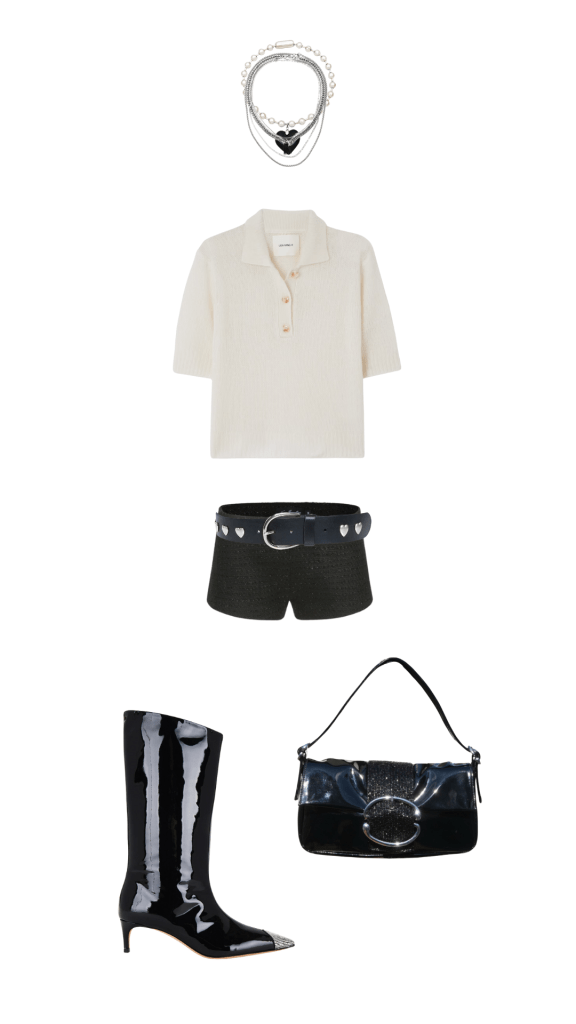 I love a knit paired with leather shorts, or a button down paired with a sparkly skirt. These swaps are so easy to make. Just think about how you’d style an outfit for the day time. If you have a top that you’d pair with denim shorts and sneakers, consider what the top would look like paired with a leather short and a heel. You can keep the silhouette the same, while swapping in pieces that work better for the occasion you’re dressing for.